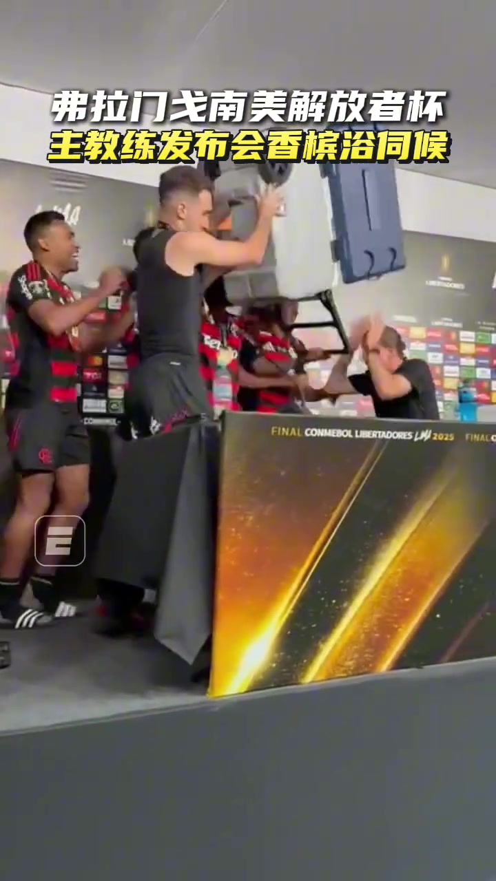 弗拉门戈主教练在发布会上惨遭香槟沐浴,这就是胜利的香槟浴嘛~