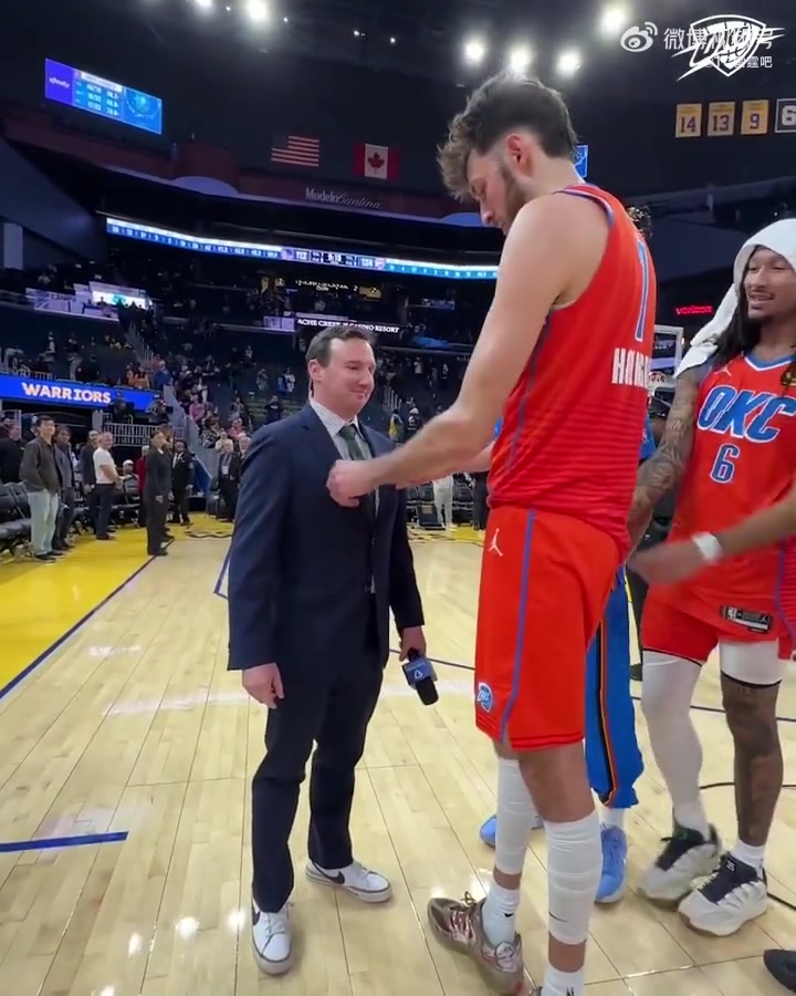 笑死!雷霆赢下勇士后,队员们还帮现场记者整理了一下衣服!